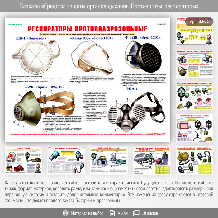 Плакаты «Средства защиты органов дыхания. Противогазы, респираторы» (ВЗ-03, 10 листов) в Черкесске купить