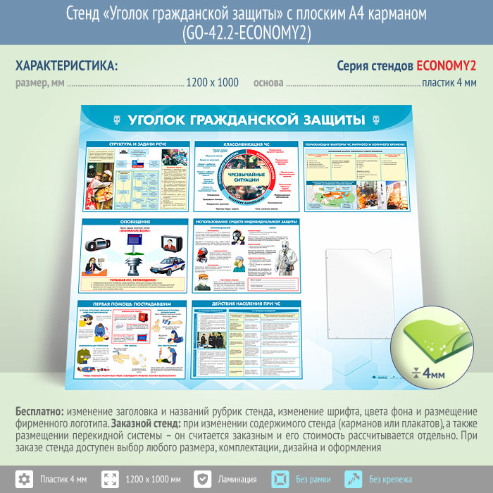 Стенд «Уголок гражданской защиты» с плоским А4 карманом (GO-42.2-ECONOMY2) в Черкесске купить