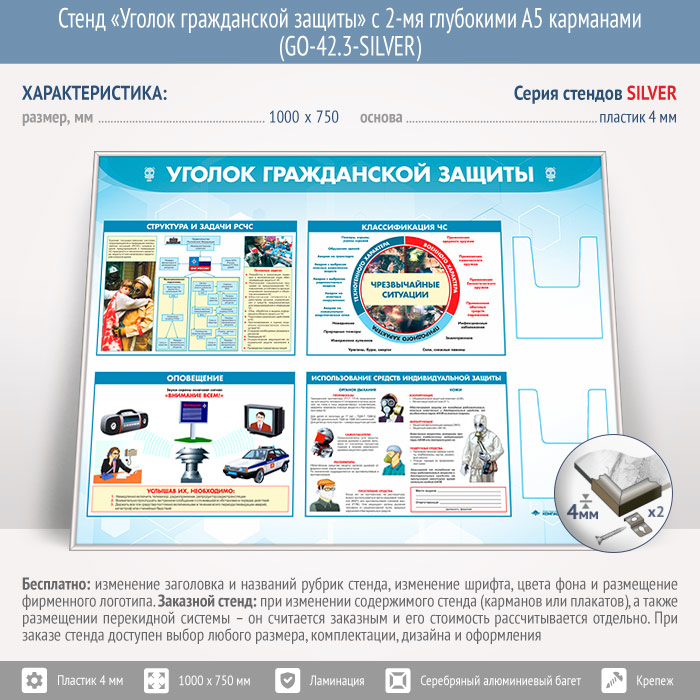 Стенд «Уголок гражданской защиты» с 2-мя глубокими А5 карманами (GO-42.3-SILVER) в Черкесске купить