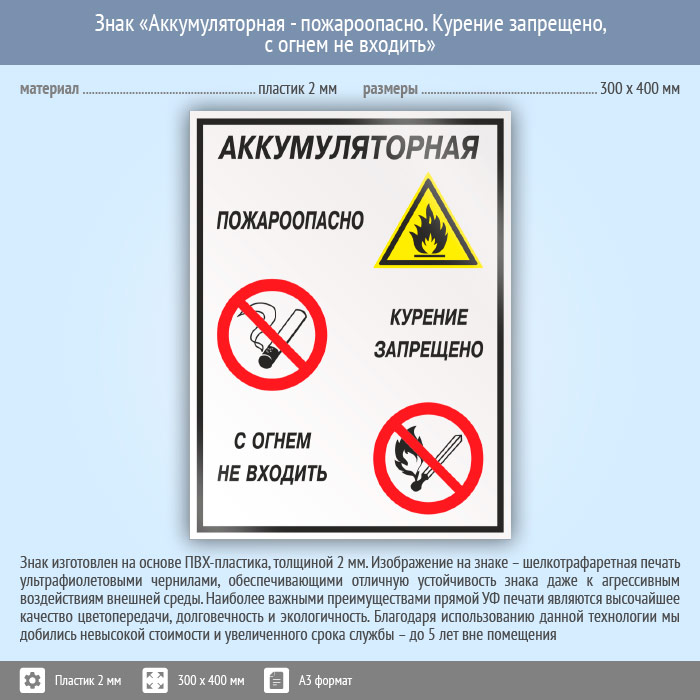 Знак «Аккумуляторная - пожароопасно. Курение запрещено, с огнем не входить», КЗ-01 (пластик, 300х400 мм) в Черкесске купить