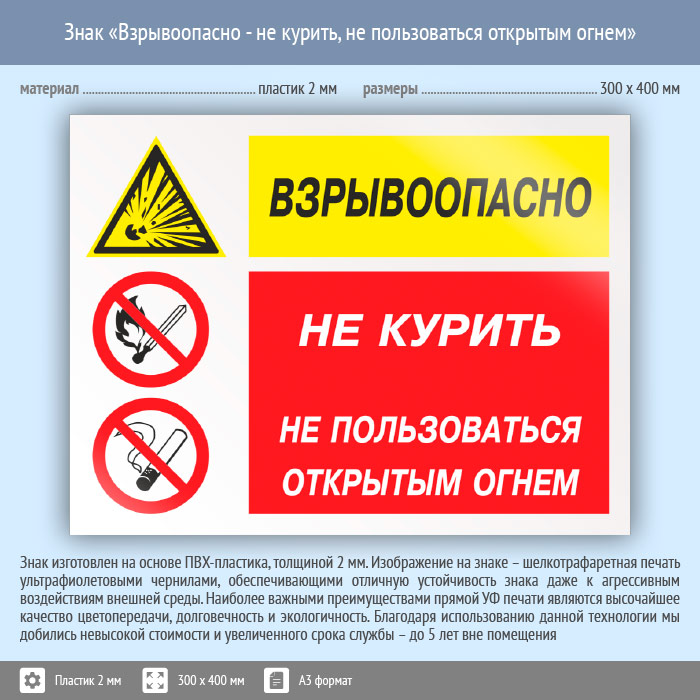 Знак «Взрывоопасно - не курить, не пользоваться открытым огнем», КЗ-05 (пластик, 400х300 мм) в Черкесске купить