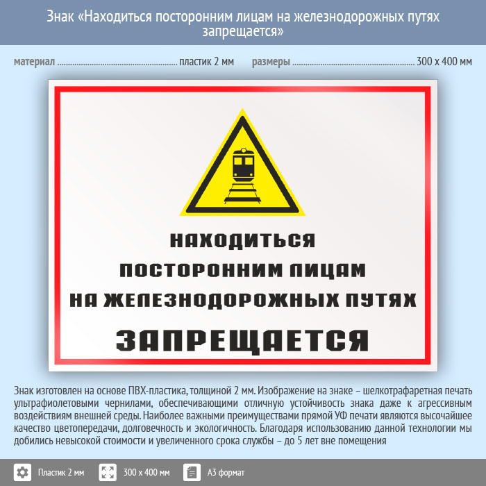 Знак «Находиться посторонним лицам на железнодорожных путях запрещается», КЗ-24 (пластик, 400х300 мм) в Черкесске купить