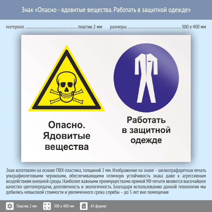 Знак «Опасно - ядовитые вещества. Работать в защитной одежде», КЗ-42 (пластик, 400х300 мм) в Черкесске купить