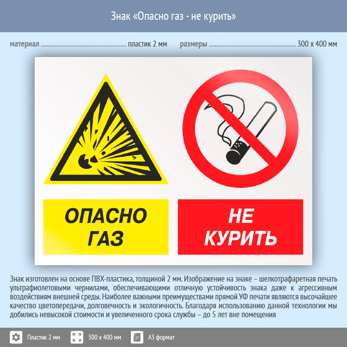Знак «Опасно газ - не курить», КЗ-44 (пластик, 400х300 мм) в Черкесске купить