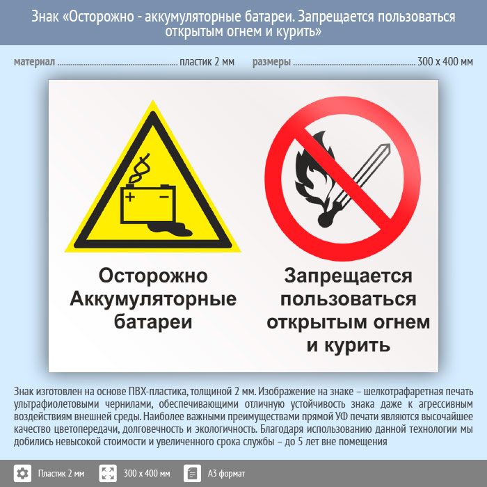 Знак «Осторожно - аккумуляторные батареи. Запрещается пользоваться открытым огнем и курить», КЗ-50 (пластик, 400х300 мм) в Черкесске купить