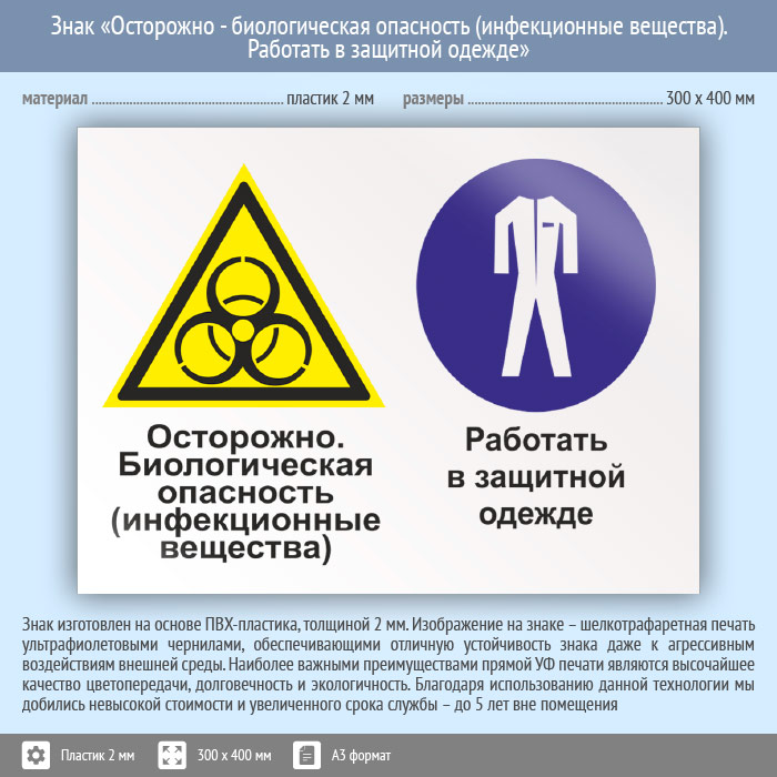 Знак «Осторожно - биологическая опасность (инфекционные вещества). Работать в защитной одежде», КЗ-53 (пластик, 400х300 мм) в Черкесске купить