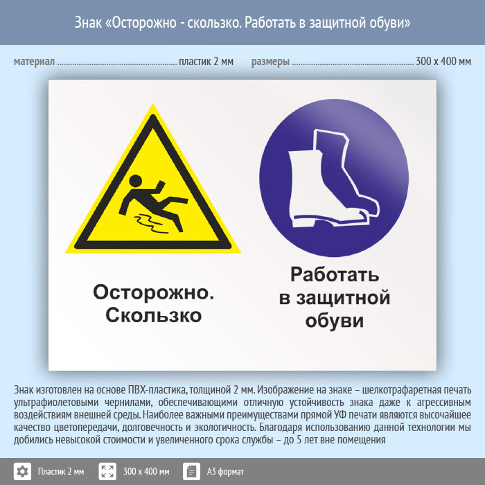 Знак «Осторожно - скользко. Работать в защитной обуви», КЗ-57 (пластик, 400х300 мм) в Черкесске купить