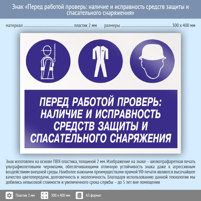 Знак «Перед работой проверь: наличие и исправность средств защиты и спасательного снаряжения», КЗ-64 (пластик, 400х300 мм) в Черкесске купить
