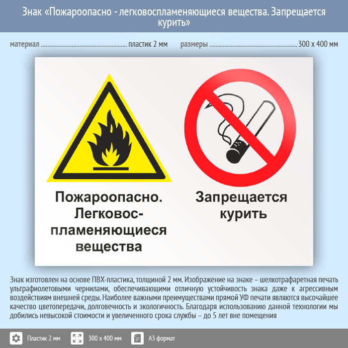 Знак «Пожароопасно - легковоспламеняющиеся вещества. Запрещается курить», КЗ-69 (пластик, 400х300 мм) в Черкесске купить