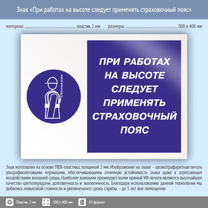 Знак «При работах на высоте следует применять страховочный пояс», КЗ-75 (пластик, 400х300 мм) в Черкесске купить
