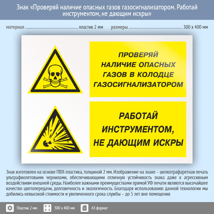Знак «Проверяй наличие опасных газов газосигнализатором. Работай инструментом, не дающим искры», КЗ-77 (пластик, 400х300 мм) в Черкесске купить