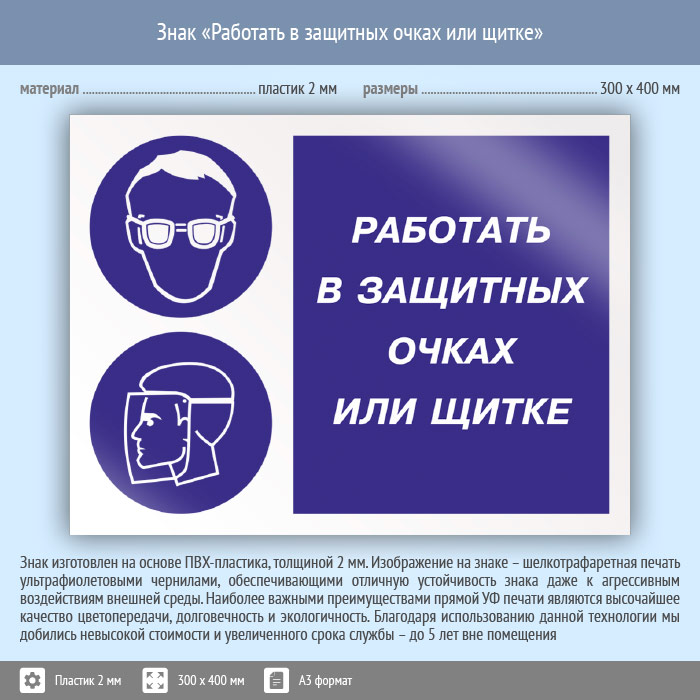 Знак «Работать в защитных очках или щитке», КЗ-80 (пластик, 400х300 мм) в Черкесске купить