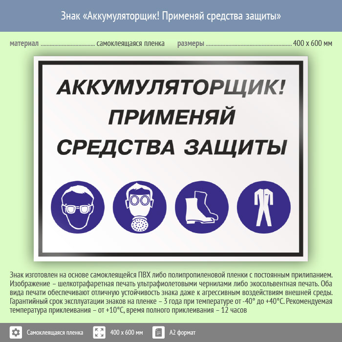 Знак «Аккумуляторщик! Применяй средства защиты», КЗ-02 (пленка, 600х400 мм) в Черкесске купить