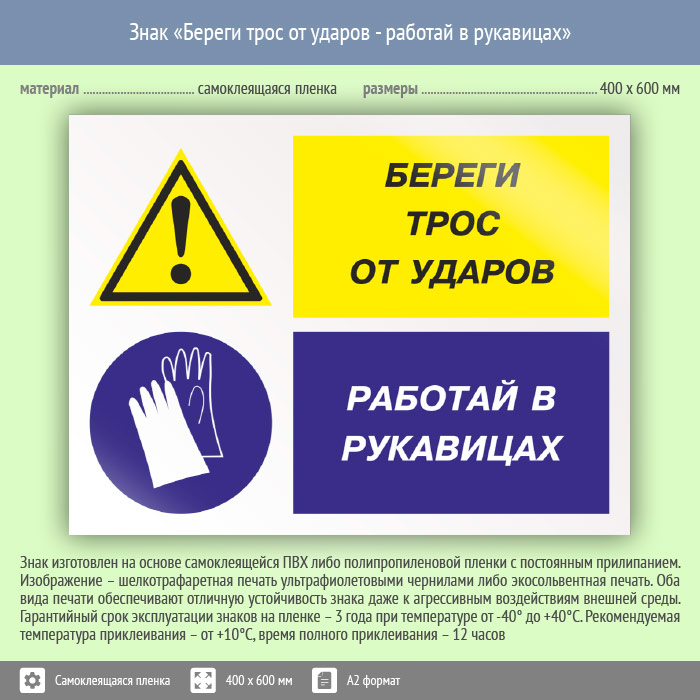 Знак «Береги трос от ударов - работай в рукавицах», КЗ-03 (пленка, 600х400 мм) в Черкесске купить