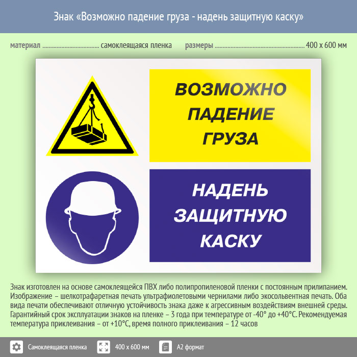Знак «Возможно падение груза - надень защитную каску», КЗ-17 (пленка, 600х400 мм) в Черкесске купить