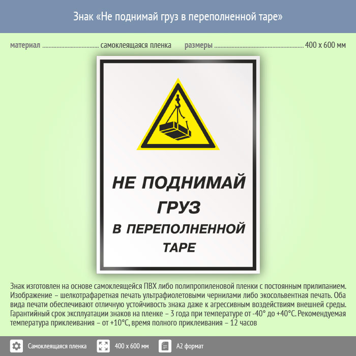 Знак «Не поднимай груз в переполненной таре», КЗ-26 (пленка, 400х600 мм) в Черкесске купить