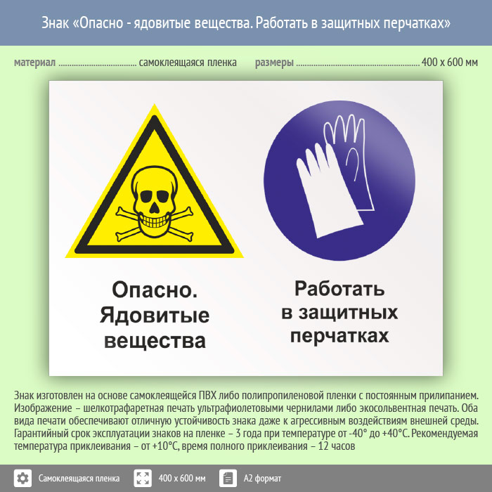 Знак «Опасно - ядовитые вещества. Работать в защитных перчатках», КЗ-43 (пленка, 600х400 мм) в Черкесске купить