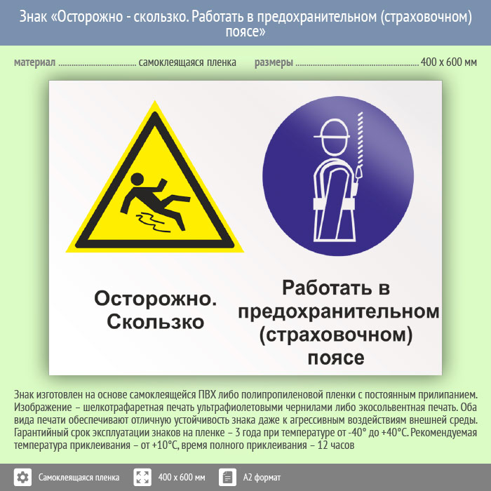 Знак «Осторожно - скользко. Работать в предохранительном (страховочном) поясе», КЗ-58 (пленка, 600х400 мм) в Черкесске купить