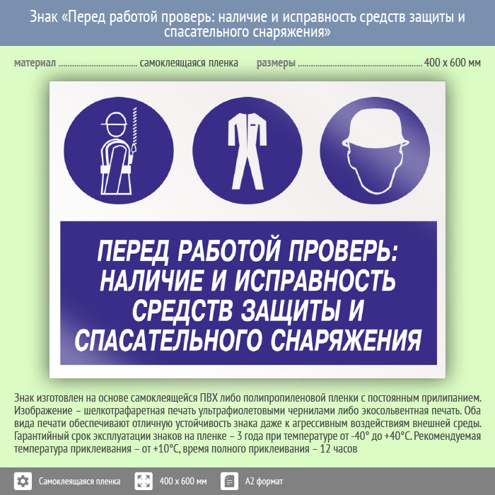 Знак «Перед работой проверь: наличие и исправность средств защиты и спасательного снаряжения», КЗ-64 (пленка, 600х400 мм) в Черкесске купить