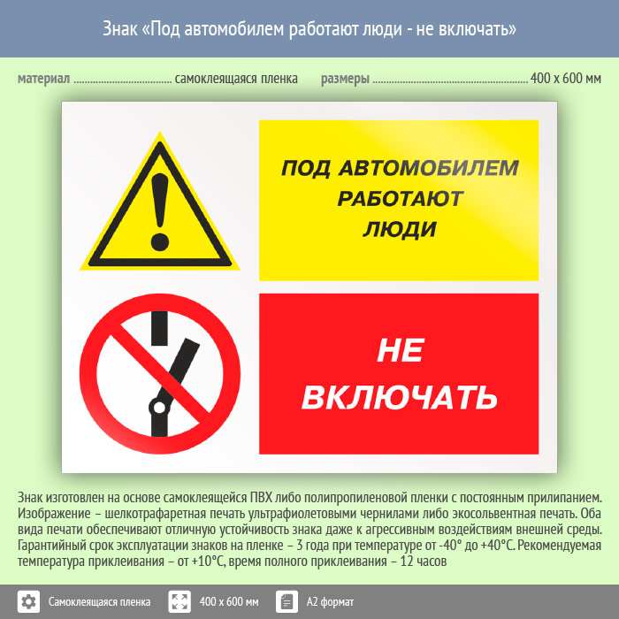 Знак «Под автомобилем работают люди - не включать», КЗ-65 (пленка, 600х400 мм) в Черкесске купить