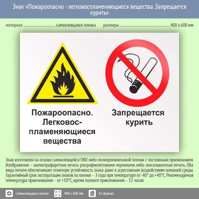 Знак «Пожароопасно - легковоспламеняющиеся вещества. Запрещается курить», КЗ-69 (пленка, 600х400 мм) в Черкесске купить