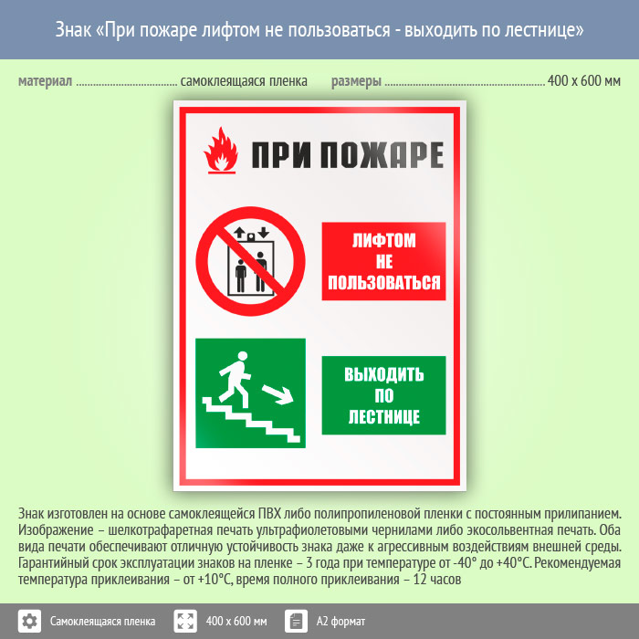 Знак «При пожаре лифтом не пользоваться - выходить по лестнице», КЗ-73 (пленка, 400х600 мм) в Черкесске купить