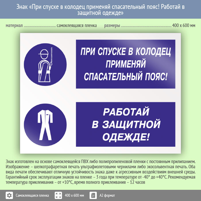 Знак «При спуске в колодец применяй спасательный пояс! Работай в защитной одежде», КЗ-76 (пленка, 600х400 мм) в Черкесске купить