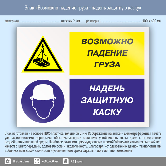 Знак «Возможно падение груза - надень защитную каску», КЗ-17 (пластик, 600х400 мм) в Черкесске купить