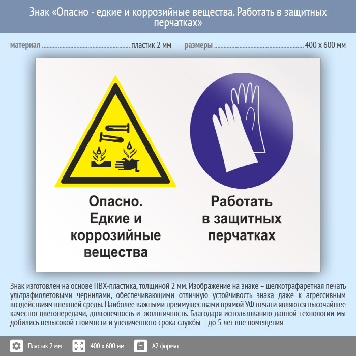 Знак «Опасно - едкие и коррозийные вещества. Работать в защитных перчатках», КЗ-36 (пластик, 600х400 мм) в Черкесске купить