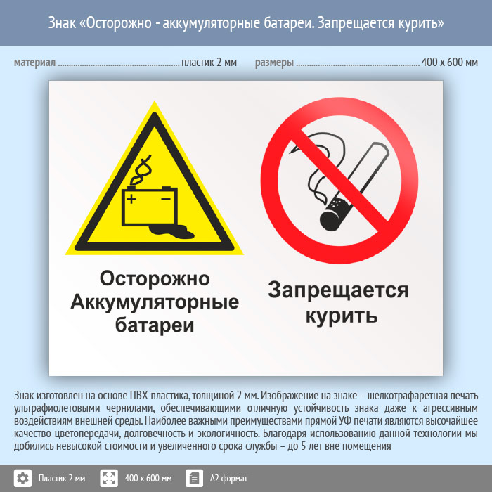 Знак «Осторожно - аккумуляторные батареи. Запрещается курить», КЗ-49 (пластик, 600х400 мм) в Черкесске купить