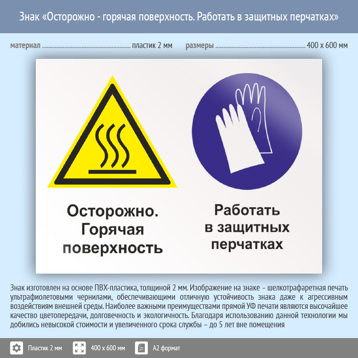 Знак «Осторожно - горячая поверхность. Работать в защитных перчатках», КЗ-55 (пластик, 600х400 мм) в Черкесске купить