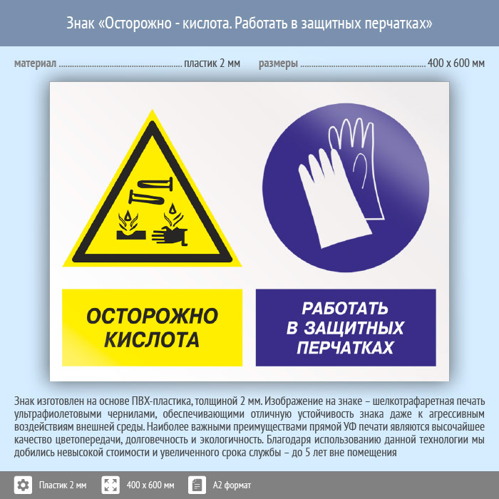 Знак «Осторожно - кислота. Работать в защитных перчатках», КЗ-56 (пластик, 600х400 мм) в Черкесске купить