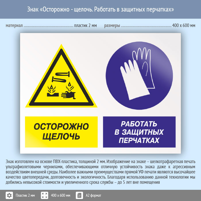 Знак «Осторожно - щелочь. Работать в защитных перчатках», КЗ-60 (пластик, 600х400 мм) в Черкесске купить