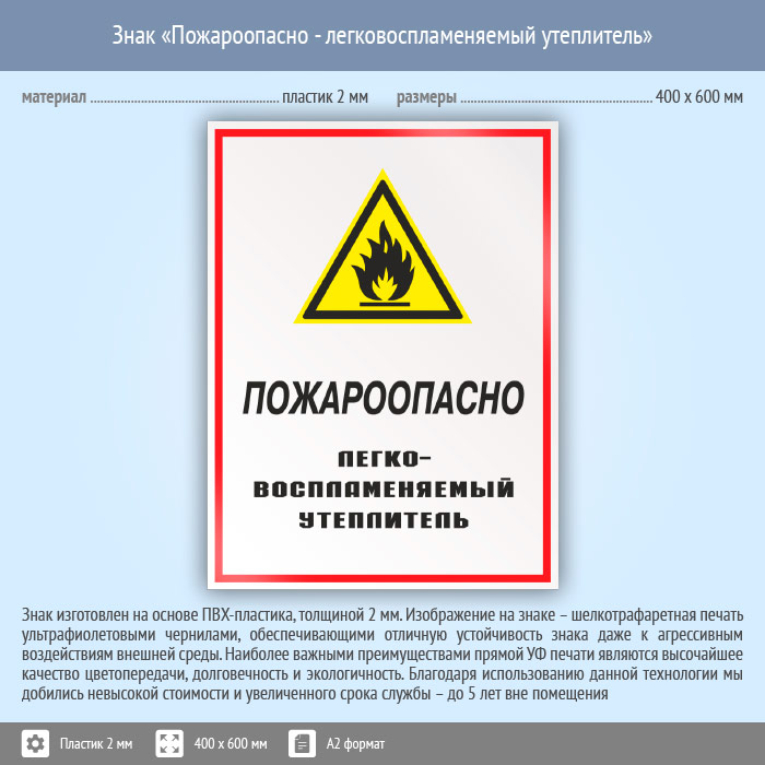 Знак «Пожароопасно - легковоспламеняемый утеплитель», КЗ-68 (пластик, 400х600 мм) в Черкесске купить