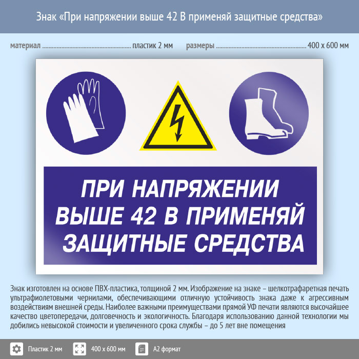 Знак «При напряжении выше 42 В применяй защитные средства», КЗ-72 (пластик, 600х400 мм) в Черкесске купить