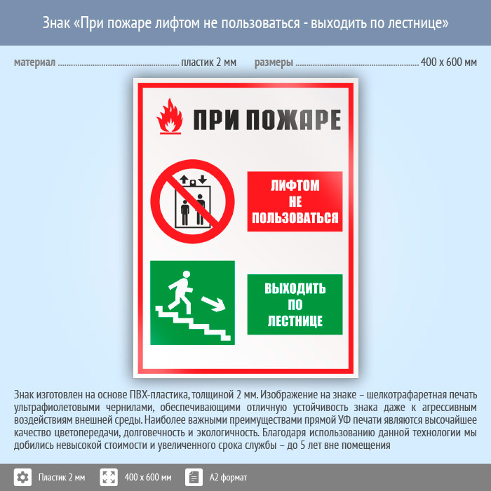 Знак «При пожаре лифтом не пользоваться - выходить по лестнице», КЗ-73 (пластик, 400х600 мм) в Черкесске купить