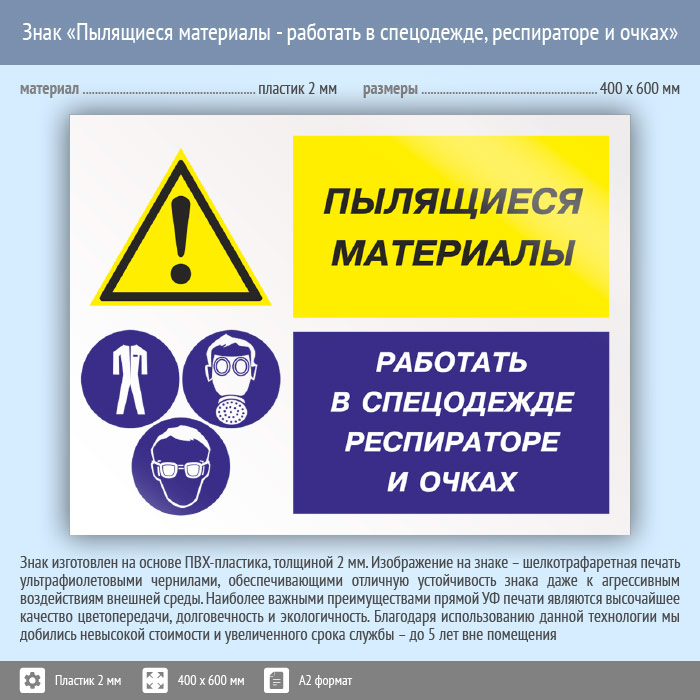 Знак «Пылящиеся материалы - работать в спецодежде, респираторе и очках», КЗ-79 (пластик, 600х400 мм) в Черкесске купить