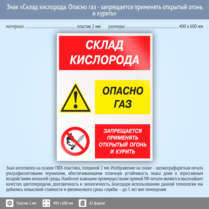 Знак «Склад кислорода. Опасно газ - запрещается применять открытый огонь и курить», КЗ-85 (пластик, 400х600 мм) в Черкесске купить