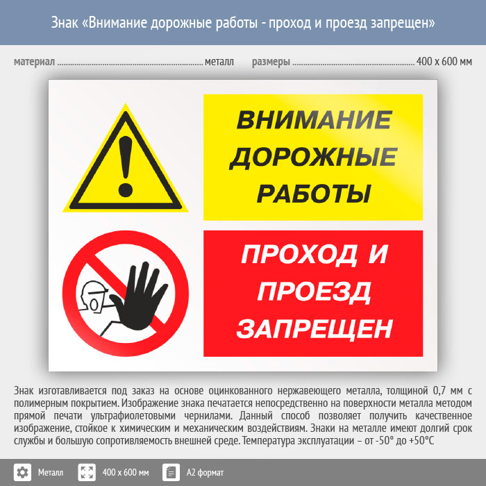 Знак «Внимание дорожные работы - проход и проезд запрещен», КЗ-14 (металл, 600х400 мм) в Черкесске купить