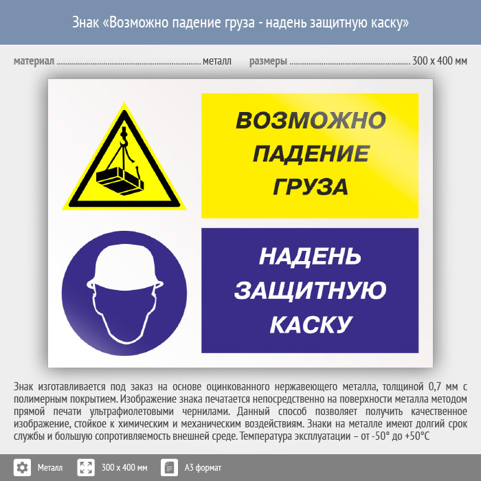 Знак «Возможно падение груза - надень защитную каску», КЗ-17 (металл, 400х300 мм) в Черкесске купить