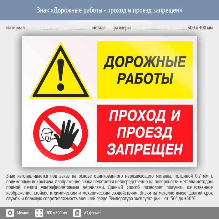 Знак «Дорожные работы - проход и проезд запрещен», КЗ-20 (металл, 400х300 мм) в Черкесске купить