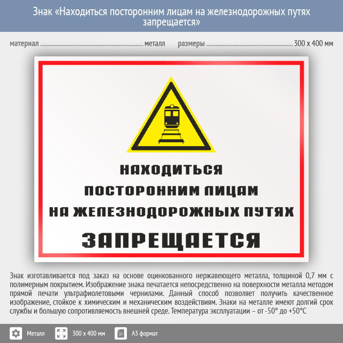 Знак «Находиться посторонним лицам на железнодорожных путях запрещается», КЗ-24 (металл, 400х300 мм) в Черкесске купить