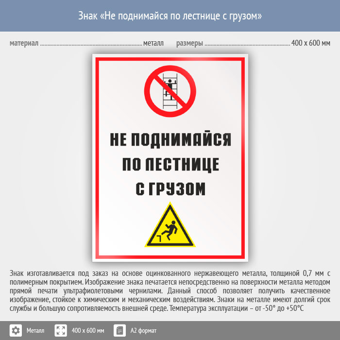 Знак «Не поднимайся по лестнице с грузом», КЗ-28 (металл, 400х600 мм) в Черкесске купить