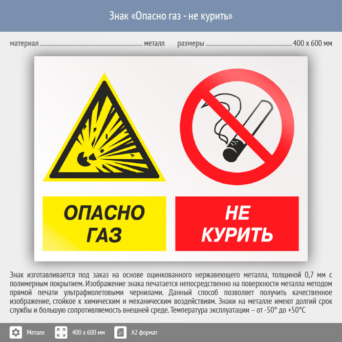 Знак «Опасно газ - не курить», КЗ-44 (металл, 600х400 мм) в Черкесске купить