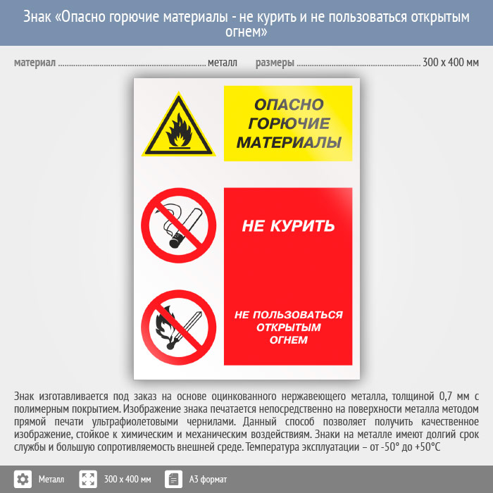 Знак «Опасно горючие материалы - не курить и не пользоваться открытым огнем», КЗ-45 (металл, 300х400 мм) в Черкесске купить