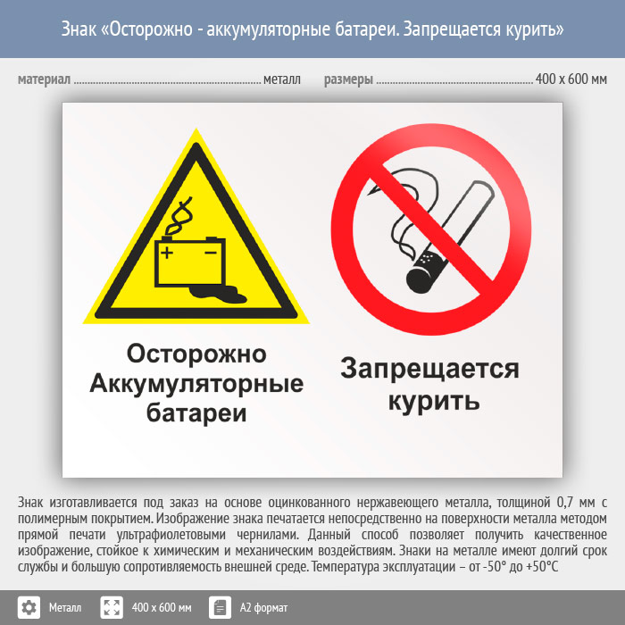 Знак «Осторожно - аккумуляторные батареи. Запрещается курить», КЗ-49 (металл, 600х400 мм) в Черкесске купить