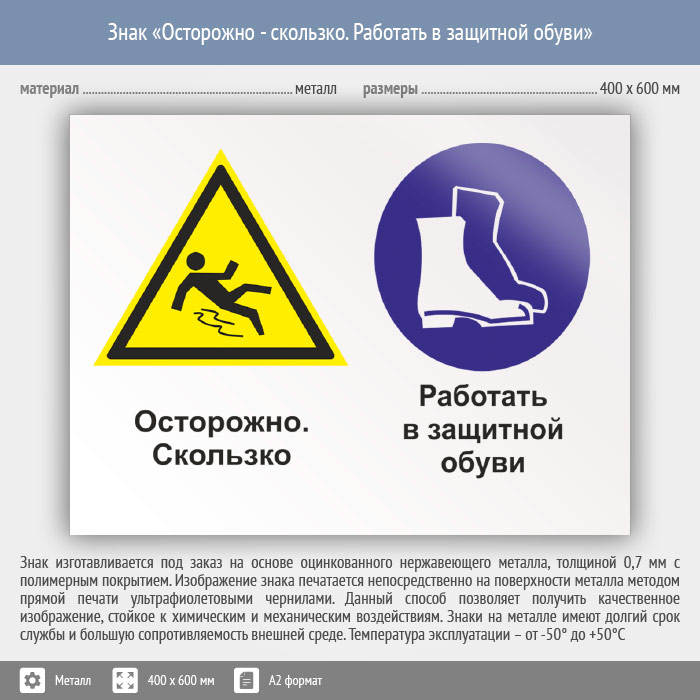 Знак «Осторожно - скользко. Работать в защитной обуви», КЗ-57 (металл, 600х400 мм) в Черкесске купить