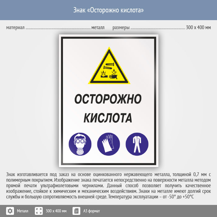 Знак «Осторожно кислота», КЗ-61 (металл, 300х400 мм) в Черкесске купить