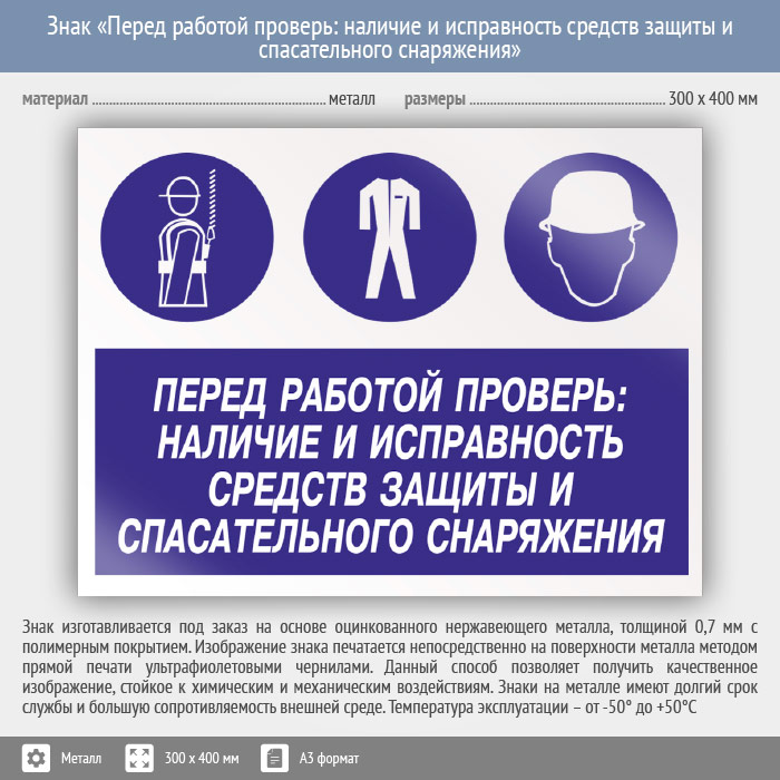 Знак «Перед работой проверь: наличие и исправность средств защиты и спасательного снаряжения», КЗ-64 (металл, 400х300 мм) в Черкесске купить