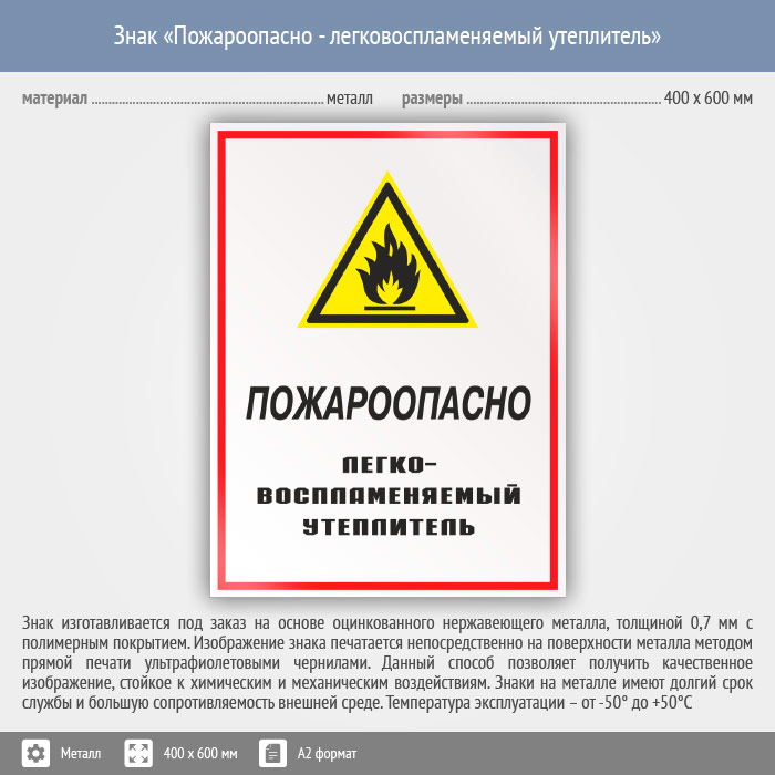 Знак «Пожароопасно - легковоспламеняемый утеплитель», КЗ-68 (металл, 400х600 мм) в Черкесске купить